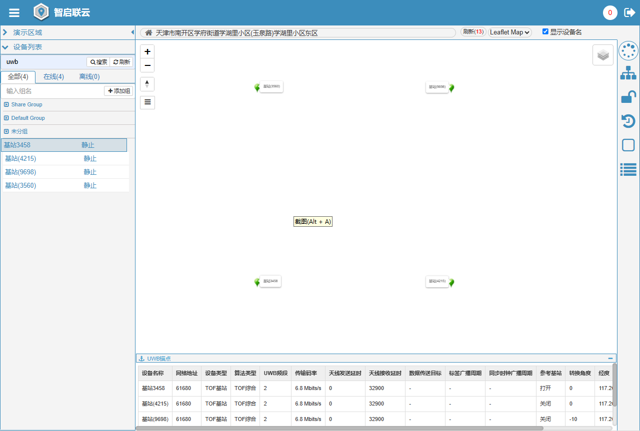 目录 搜索 展开 引言综述位置应用UWB技术定位算法定位维度定位坐标系UWB硬件UWB&GPS定位标签uwb定位工卡标签UWB定位锚点4G UWB基站UWB平台锚点坐标标注地图引擎标签位置更新轨迹回放电子围栏 暂无相关搜索结果! 阅读次数:247 锚点坐标标注 UWB平台WEB前端视图,可设定锚点坐标,通常锚点的网络ID,对应一个区域笛卡尔坐标系,不同的区域,应分配不同的网络ID,每个区域,应指定一个wgs84参考锚点,该锚点需要提供一个wgs84坐标,以便平台将该区域映射到wgs84坐标系中。下图为一个区域中4个锚点设定了坐标,并切换到锚点坐标系。作者:陈峰 创建时间:2024-11-21 00:04最后编辑:陈峰 更新时间:2024-11-21 03:55