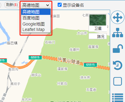 设备位置图标坐标更新,支持定时刷新和实时刷新,前端界面默认按30秒定时刷新所有在线设备图标,对于已关注的设备,后端在收到新位置上报后,会主动推送坐标消息到前端,完成实时刷新功能。
