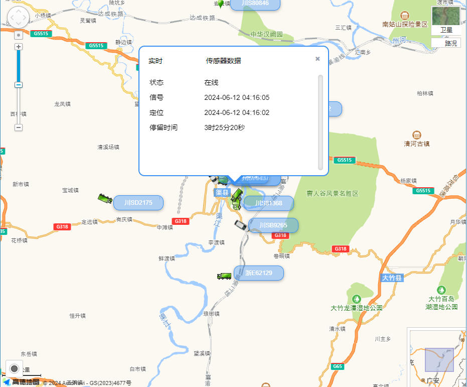 在左侧设备树面板中点选设备或直接在地图监控界面中点选位置图标,都可以触发显示设备状态浮动框。
