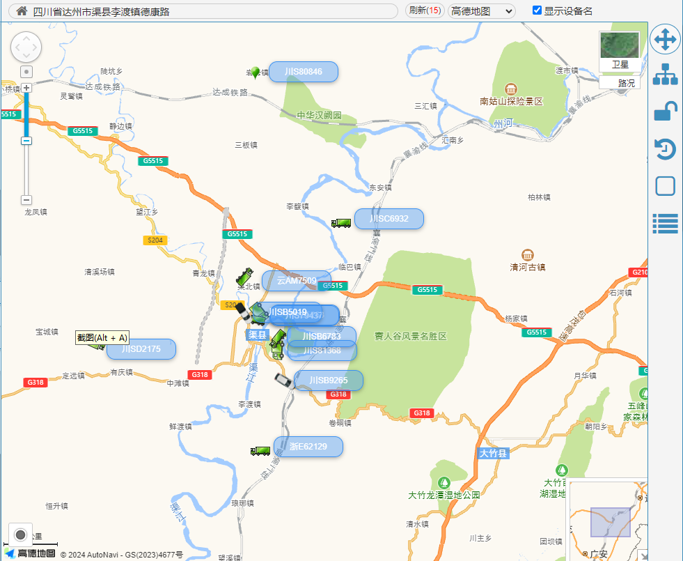 地图监控界面,支持GPS坐标系和锚点坐标系,锚点坐标系以笛卡尔坐标系为基础,通过人工标注锚点经纬度,完成设备图标二维坐标到GPS坐标系的映射,当切换到锚点坐标系,设备位置图标将采用独立的经纬度坐标,在地图上标注。