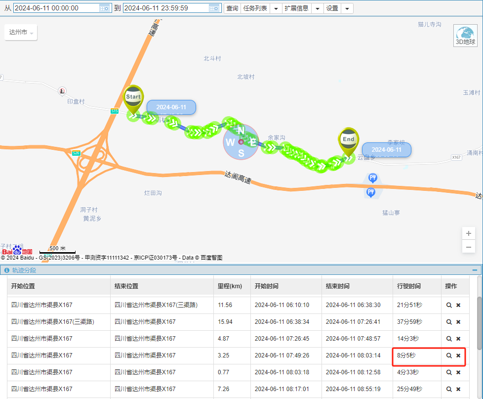 在轨迹分段面板中,第一行记录,是所查询时间段中的完整轨迹,其余便是该时间段内的分段轨迹,通过点击
