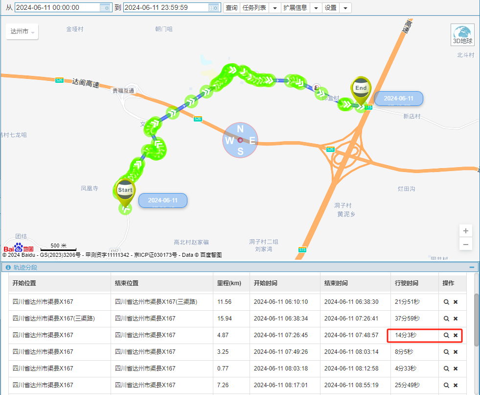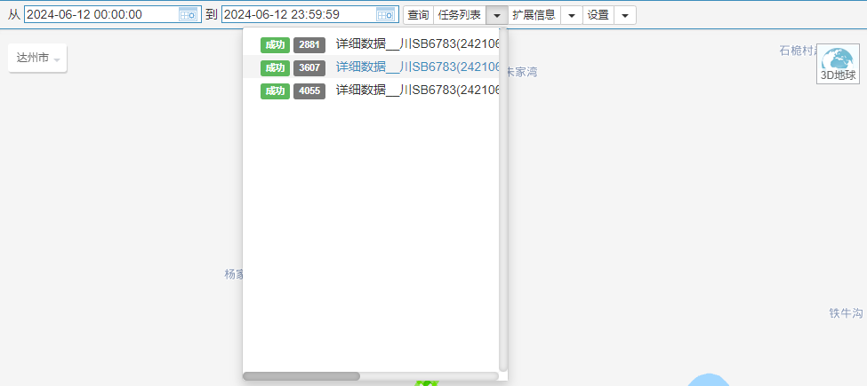 在任务列表中,点选一个已完成的查询任务,并将轨迹类型切换为行驶轨迹,地图界面会加载完整的轨迹视图。