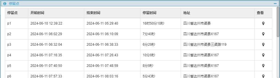 停留点面板用于显示所查询轨迹中的停留点记录,每个停留点记录在地图上可对应一个停留点图标。