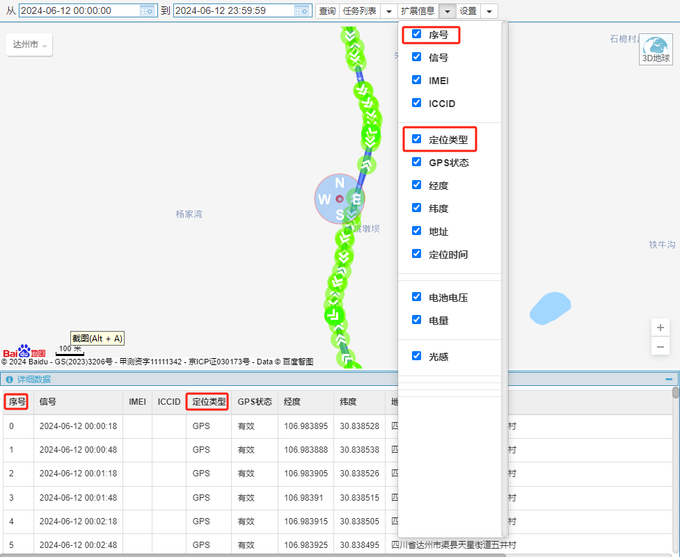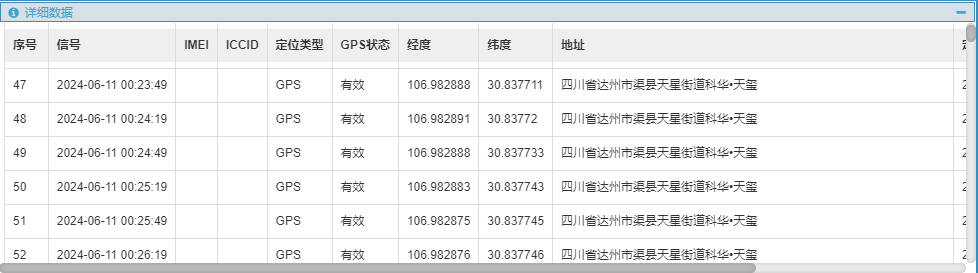 详细数据面板用于显示所查询时间段中的所有轨迹点记录,记录包含的字段,可通过扩展信息面板中对应的复选框状态来控制其显示或隐藏。