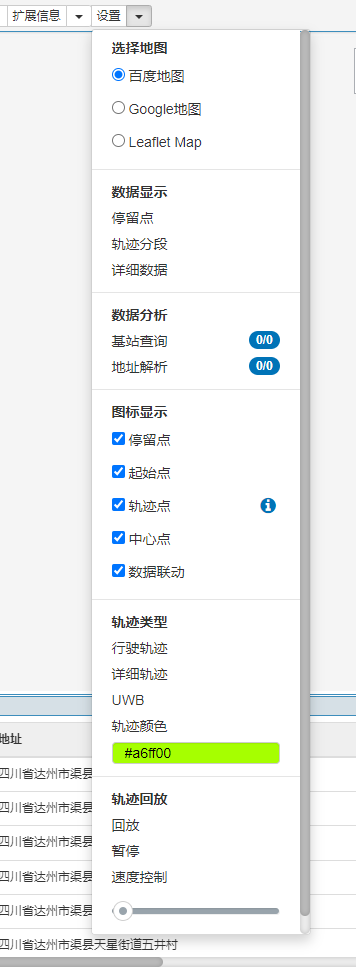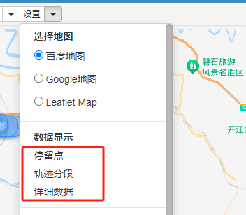 通过设置面板,可在轨迹回放界面底部加载停留点、轨迹分段、详细数据面板