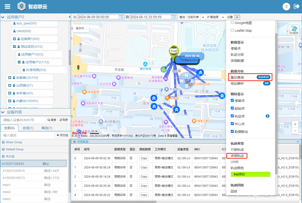 对于支持上报移动基站/wifi信息的设备,如果gps定位无效,点选查询任务加载轨迹数据,会自动触发基站查询,默认查询的是详细数据面板中第一页数据,翻页会再次触发当前页的基站数据查询,点击详细轨迹,可预览查询已完成的基站定位轨迹,如果想查询全部基站数据,可以点击设置面板中的基站查询选项。