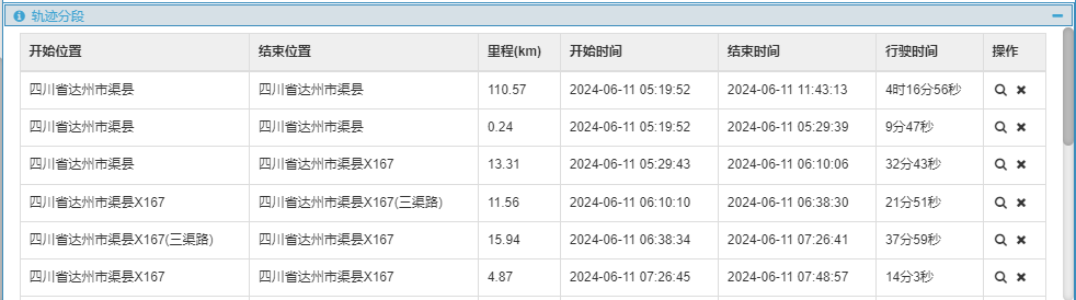 轨迹分段面板用于显示所查询时间段中的分段行驶轨迹记录,每个分段轨迹记录,在地图上可对应一段轨迹,可独立显示。