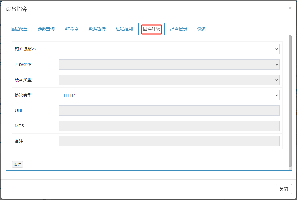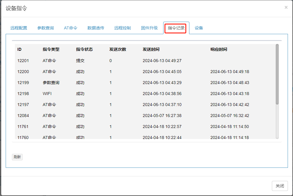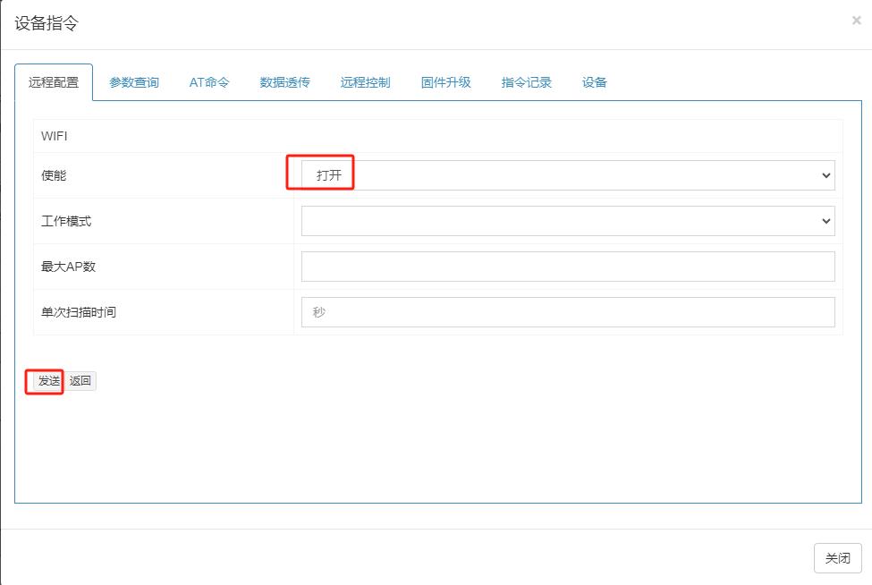 设备指令下发功能,可实现设备参数配置、AT指令下发、控制设备重启、设备OTA固件升级等功能。