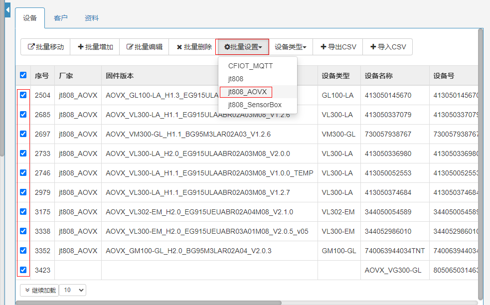 由于平台首页设备面板中,每次只能点选一个设备,不能多选设备,所以要跳转至用户中心进行批量下发指令操作。