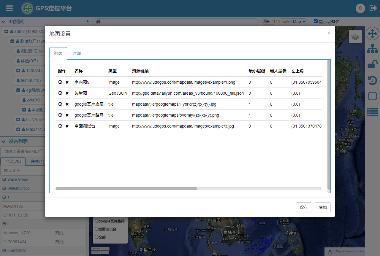 在平台首页右侧工具栏中,点地图设置按钮,弹出地图设置面板,在该面板中,可以对自定义图层新增、修改、删除操作。